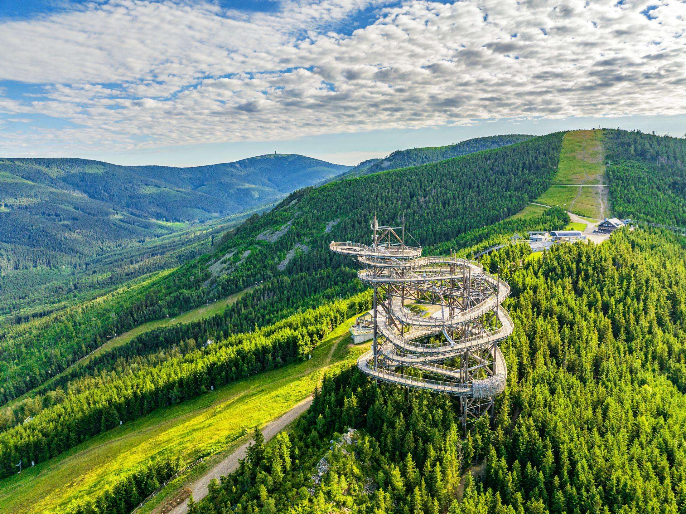 Dolní Morava 19 56169 Dolní Morava, Česko 583 239 239 Stezka v oblacích Dolní MoravaStezka v oblacích je známá turistická atrakce v horském resortu Dolní Morava v Pardubickém kraji. Jedná se o vysokou dřevěnou vyhlídkovou stavbu, která umožňuje návštěvníkům projít se nad korunami stromů a užít si panoramatické výhledy na hory. Stezka se nachází u horní stanice lanovky Sněžník v nadmořské výšce asi 1116 m. Z vrcholu je vidět masiv Králický Sněžník, údolí řeky Moravy i okolní pohoří. Na vrchol vede dřevěná spirálová lávka, po které se dá pohodlně vystoupat až na vyhlídku. Celá konstrukce je bezbariérová a vhodná i pro rodiny s kočárky. |